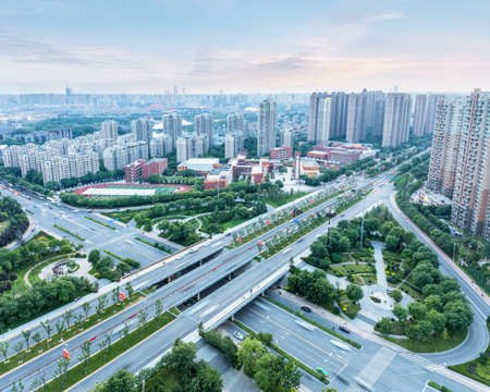 Chengdu, Sichuan province, China - Aug 11, 2019 - Chengdu city skyline aerial view in late afternoon with Jinjiang river.