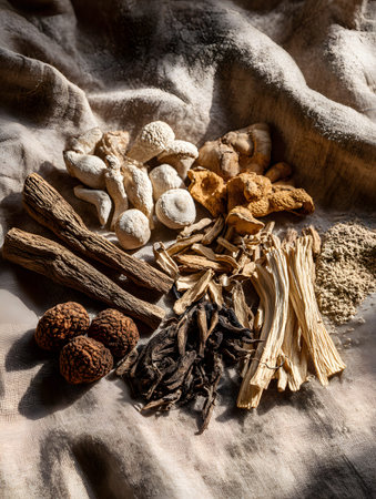 An assorted dried adaptogenic herbs and mushrooms arranged on textured fabric, warm natural lighting evokes earthy calm