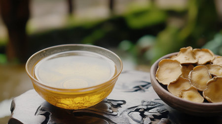 A serene image of brewed herbal tea accompanied by dried ingredients, set in a natural environment that highlights relaxation and wellness.