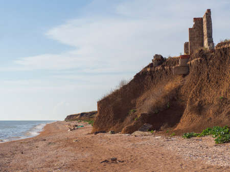 A wild sea beach with a clay steep shore. The washed-out shore collapses along with the buildings standing on the edge. Deserted abandoned shell-and-sand beach.