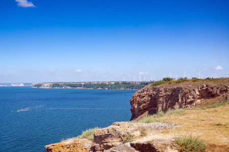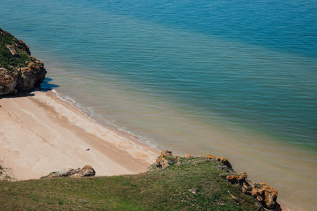 Breathtaking coastal landscape with towering cliffs alongside a calm, expansive sea under a clear blue sky. Grand Canyon Stanislav, Ukraine. Ideal for themes of nature, relaxation, and adventure.