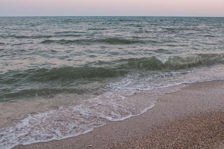 sea wave washes yellow beach of pebbles sea occupies a large area of the picture is in the corner of coast