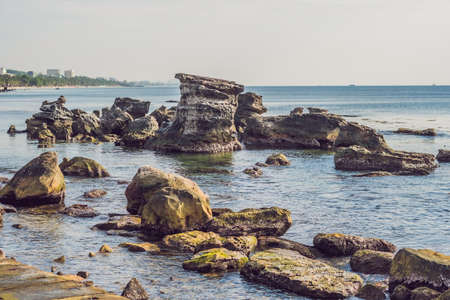 Rocks in the sea and view of the island of Phu Quoc, Vietnam.