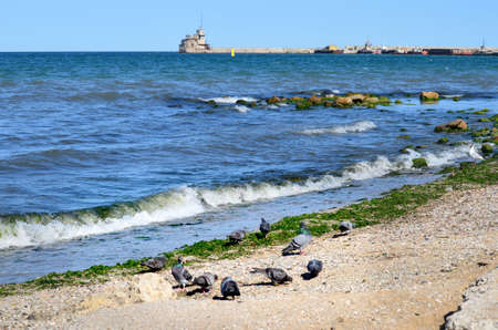 A beautiful shot of a sea with old lighthouse and blue sky in the background birds walk on the beach in the foreground, Feodosia