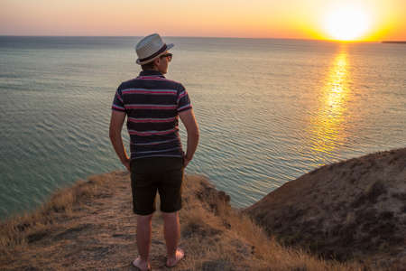 A guy in shorts, striped t-shirt, hat and sunglasses standing on a high cliff by the sea or ocean on sunny summer day. Back view of young man watching sunset on the shores of the calm sea.