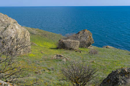 Blooming wildflowers on the shores of Cape Meganom. This area is semi-desert for most of the year. Crimea, sunny day at the end of April.