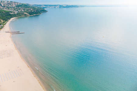 Aerial drone view of Albena empty sandy beach resort, Bulgaria