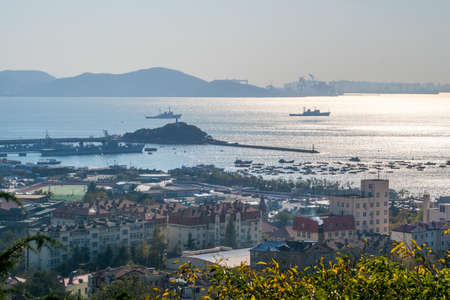Vladivostok, Primorsky Krai-August 26, 2018: Seascape with ships on the background of the coastline of the city.