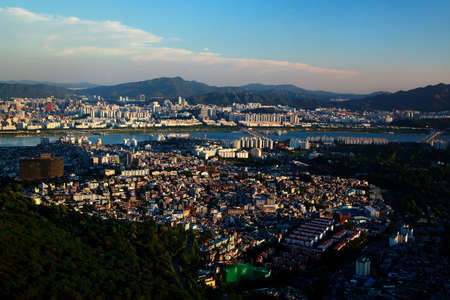 Busan sunset city panorama, beautiful skyline view with high-rise buildings skyscrapers at dawn, Busan port daybreak, cityscape with harbor bay, South Korea, Yeongnam district, sunny day
