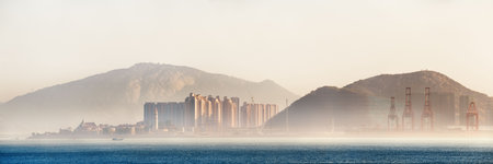 View of the foggy city from the mountains in the early morning, Shenzhen, China, Asia