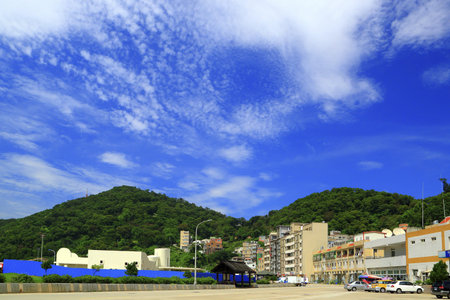 Beautiful fishing village, blue sky and white clouds, sea and small boats