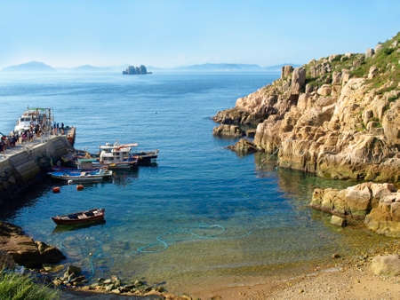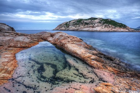 Rocky coast at Shek O Beach, on Hong Kong Island, Hong Kong.