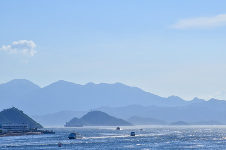 The view of the sea in the sunny day with blue sky and mountain and ships in the background. Calm sea and water. Sea background, wave pattern. Nature concept.