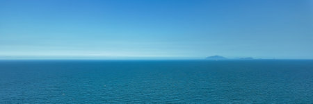 Serene ocean view with distant mountains under a clear blue sky, perfect for travel and vacation themed designs