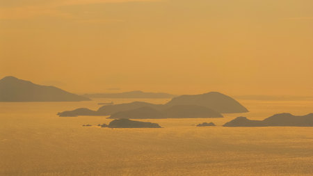 Beautiful aerial view of sea and mountain landscape at sunset in summer