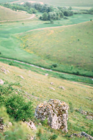The big stone on the mountains at the blurred background of the green fields and forests