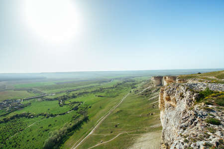 An elevated view from a Aq Qaya cliff of landscape in nature, rural road, village at bottom