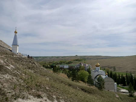 Holy orthodox churches and monastery in caves of the hills of chalk mountains in early spring season with fresh green leaves and grass