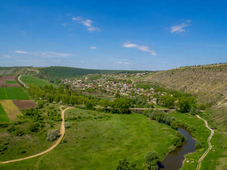 Aerial drone view of nature in Moldova. village located near a hill slopes