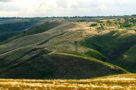 Slopes of hills summer landscape. Valley on the hillside with green and feather grass.