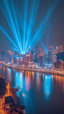 Cityscape with light show and firework celebration. Firework show celebrating Chinese new year