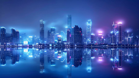 Stunning view of the central business area of Guangzhou on the riverside of Zhujiang River with illuminated skyscrapers and reflection in water, Guangdong Province, China