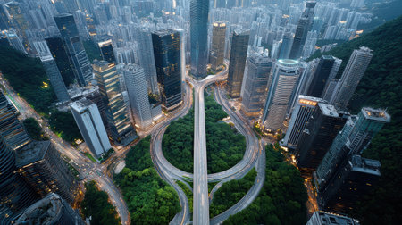 An Aerial view of futuristic city with sleek roads and skyscrapers
