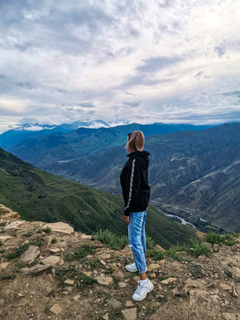 A girl on the background of a mountain view from the ancient village of Goor. Russia, Dagestan