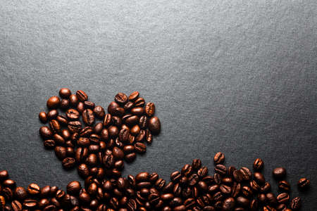 Coffee. Roasted coffee beans spilled freely on a concrete background.