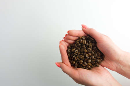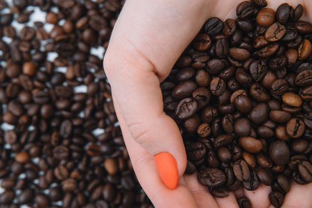Image of a woman holding a roasted coffee bean in her hands, close-up, top view. The concept of making coffee