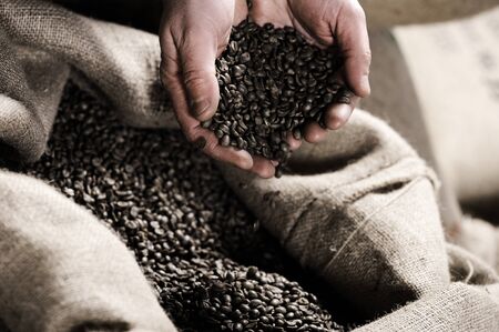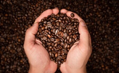 Men's hands hold a handful of coffee beans. Roasted coffee beans. Background.