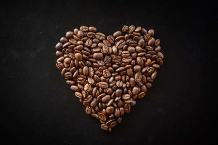 Brown coffee beans in form of broken heart isolated on black texture background for design. Saint Valentine's Day card on fabruary 14, holiday concept