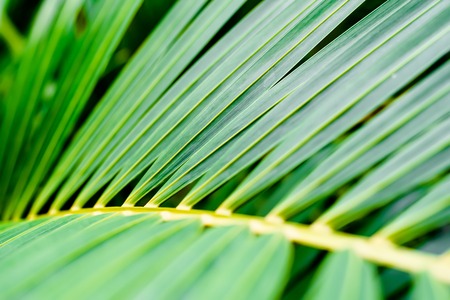 Close up of a green palm leaf with shallow depth of field.
