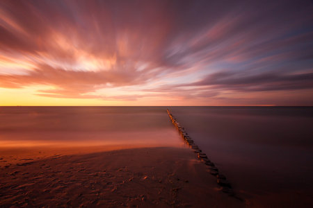 Setting sun seen from the beach in Darłówko, Poland. Beautiful seascape. Wooden breakwater on the horizon. Blur effect (long exposure)