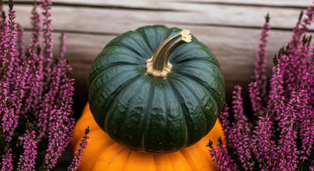 Green squash resting atop an orange pumpkin surrounded by vibrant purple heather plants outdoors