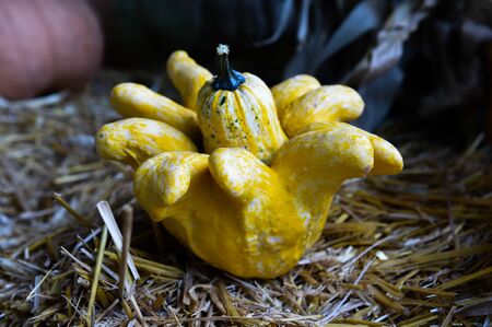 Decorative yellow pumpkins on display at the farmers market. high quality photo