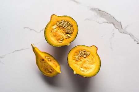 Variety of colorful pumpkins, edible and decorative. Autumn food background. Flat lay, close up