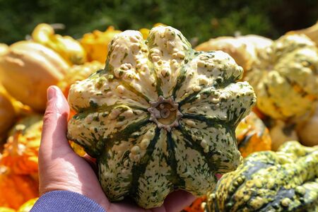 Variety of colorful ornamental pumpkins, gourds and squashes in the market, harvest and autumn concept