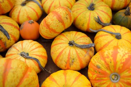 Closeup of a bunch of ripe small pumpkins captured the market for fruits and vegetables.