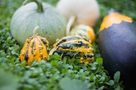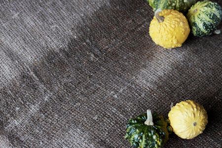 Five decorative green and yellow pumpkins arranged on a surface covered with wet coarse burlap, Decorative mini pumpkins,