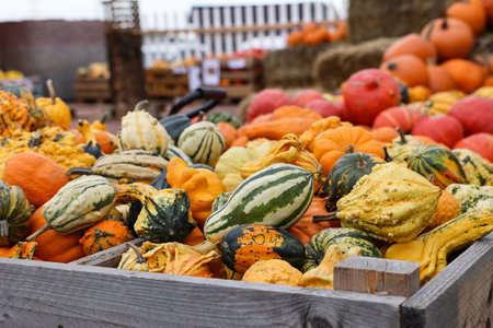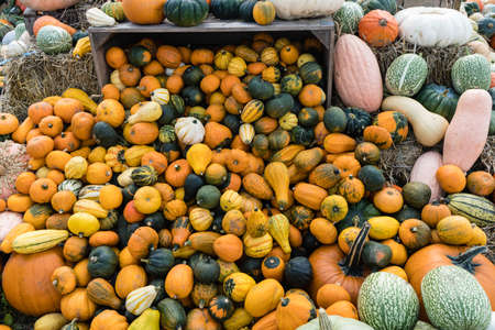 Autumn harvest colorful pumpkins and squashes in different varieties at farm market or seasonal festival. Background of decorative fall and winter squashes