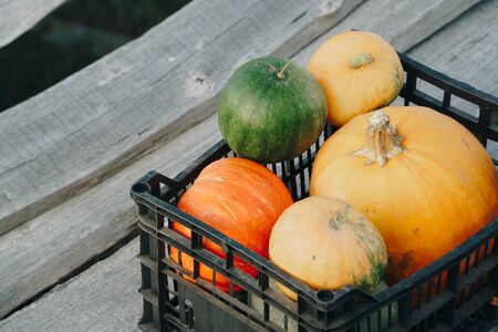 Autumn pumpkin background. A rich harvest of small pumpkins on a wooden background. The concept of a Halloween or Thanksgiving holiday.