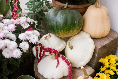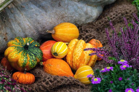 Colorful decorative pumpkins. Halloween decor with various pumpkins and flowers. Autumn crop, gather or harvest.