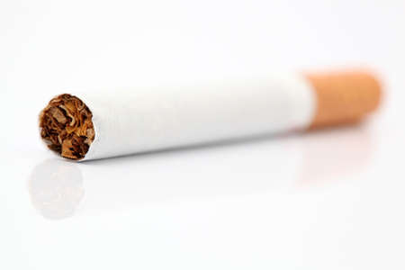 on cigarette with reflection focus on tobacco on white background