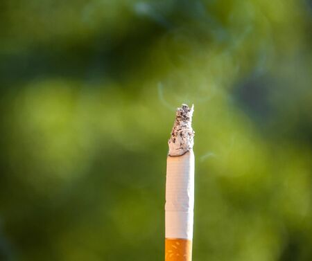 Cigarette with smoke and blurred bokeh as background on a Sunny day, to quit the action of Smoking.