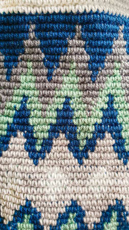 a geometric pattern on a knitted fabric. Christmas ornamental knitting. knitted sweater background texture. Real knitted fabric textured background