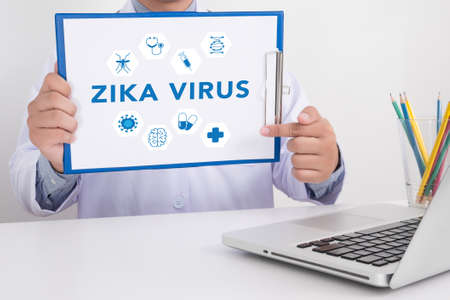 Portrait of a doctor writing a Doctor hand pointing on Zika virus concept