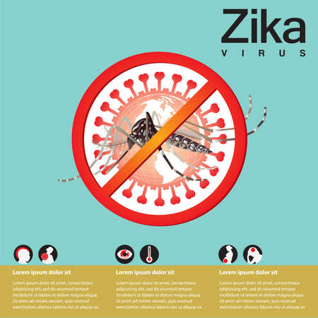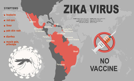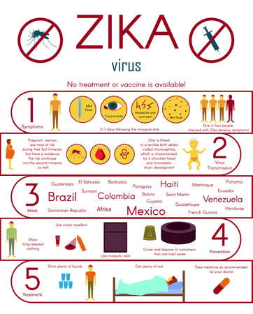 Zika virus infographic elements - prevention, transmission, vaccine, symptoms, microcephaly, protection measures. Zika virus disease. Zika virus design template. Isolated vector illustration.