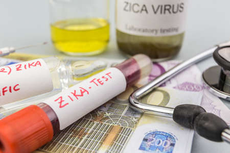 Tests for Research of ZIKA test and vials on tickets of euro, concept of pharmaceutical copayment