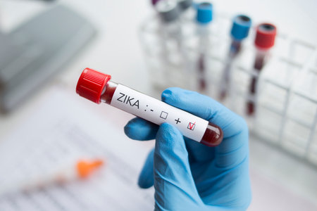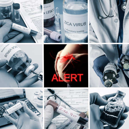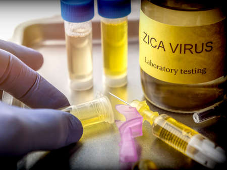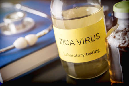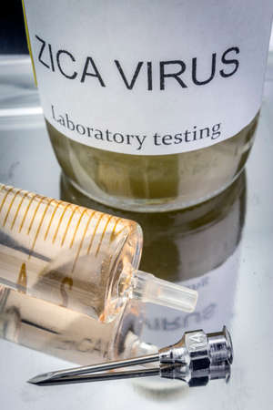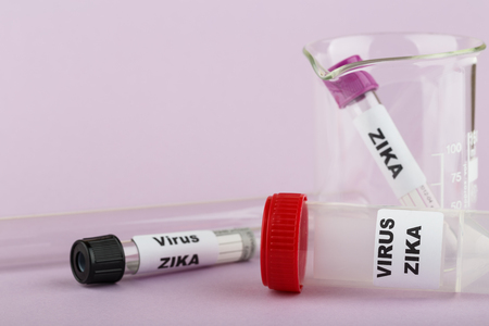 Zika virus diagnosis. Blood test sample with Zika virus stamp,
